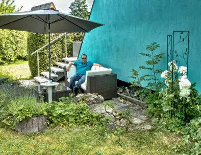 Terrasse am Wohnzimmer mit Outdoor Essbereich und eine Lounge Markise vorhanden Terasse im Garten mit Lounge und Sonnenschirm