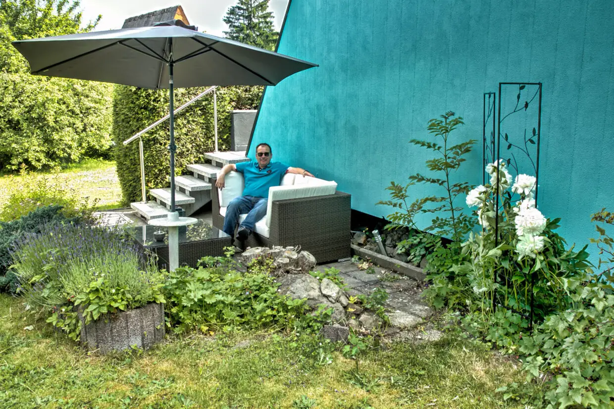 Terrasse am Wohnzimmer mit Outdoor Essbereich und eine Lounge Markise vorhanden Terasse im Garten mit Lounge und Sonnenschirm